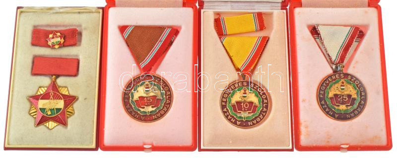 1989. "Szakszervezetek Országos Tanácsa, Szakszervezeti Munkáért arany fokozata" kitüntető jelvény aranyozott bronz kitüntetés, szalagsávon miniatűrrel, sérült dísztokban + 1965. "Szolgálati Érdemérem - A Haza Fegyveres Szolgálatában" 10, 15 és 25 év után műgyantás bronz kitüntetések mellszalagon, szalagsávval, eredeti tokban (3xklf) T:AU-VF, hibás tokok
