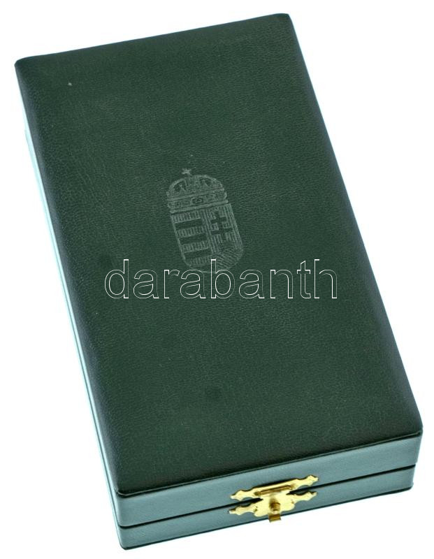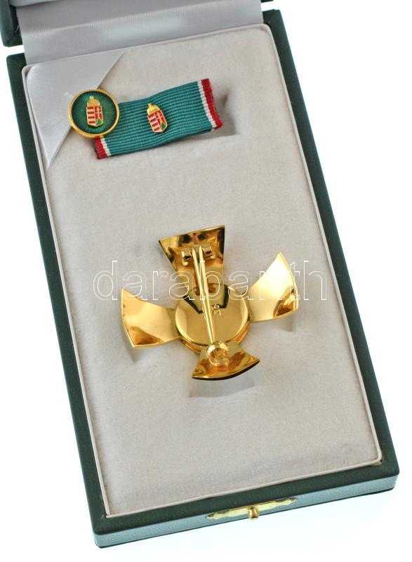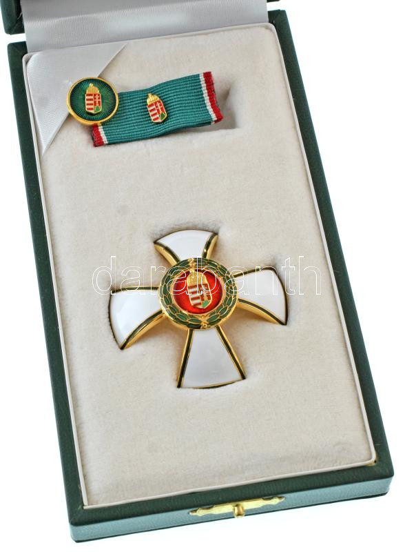 1991. "Magyar Köztársasági Érdemrend tisztikeresztje, polgári tagozat" zománcozott, aranyozott kitüntetés, hátlapi tű fémjel nélkül, szalagsávval, miniatűrrel, eredeti adományozói tokban T:UNC / Hungary 1991. "Order of Merit of the Hungarian Republic, Officer's Cross, Civil Grade" enamelled, gilt decoration, pin without hallmark, with service ribbon and miniature in original case C:UNC
