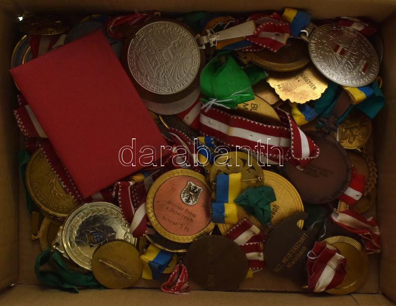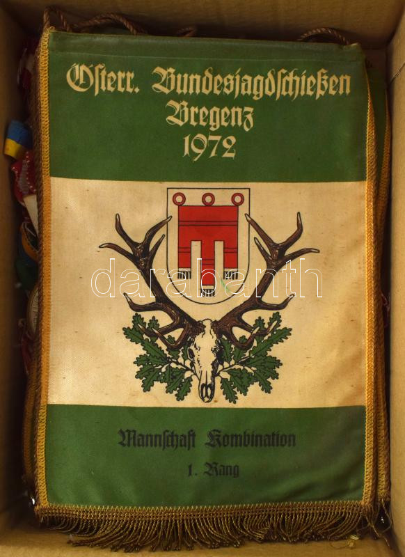 Egy doboznyi, főleg német nyelvterületről származó lövészeti díjérem + 1970 k. "Szakszervezetek Országos Tanácsa ezüst fokozat" ezüstözött, műgyantás kitüntető jelvény, mellszalaggal, tokban + 3db asztali zászló T:vegyes