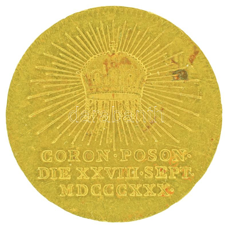 1830. "V. Ferdinánd pozsonyi koronázására" Au koronázási zseton. "CORON POSON DIE XXVIII SEPT MDCCCXXX / FRANC I ET PER EVM FERD V" (3,48g/20mm) T:AU folt