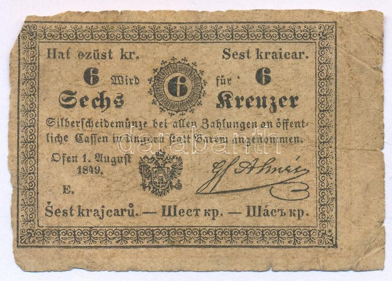 https://www.darabanth.com/en/514-Auction-philately-postcards-numismatics-artwork-books-colletibles-jewelry/515.0/Numismatics/Hungarian-Banknotes~1309/1849-6kr-Almasy-E-sorozat-TVG3Cbr-3E-Hungary-1849-6-Kreuzer-Almasy-E-prefix-CVG3Cbr-3E-~II3479690