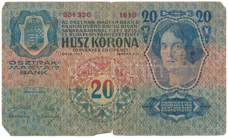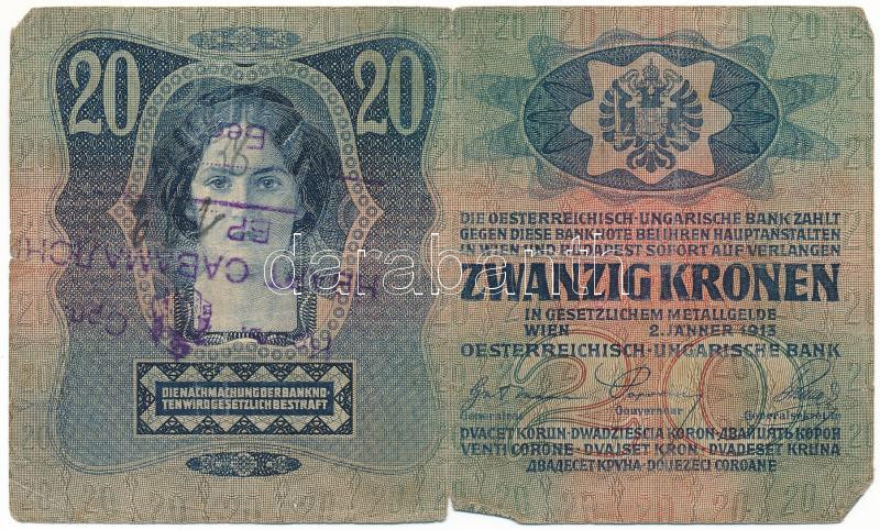 1913. 20K " 2197 149812" I. kiadás, hamis(?) felülbélyegzéssel T:F, szakadás
