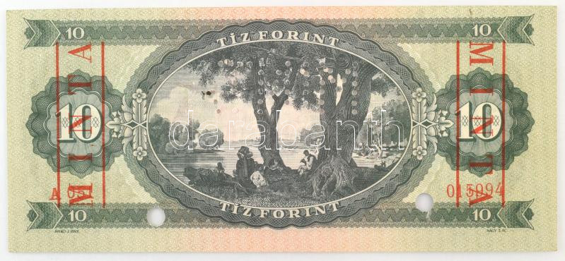 Description: 1962. 10Ft "A 051 015994" sorozat és sorszámmal illetve piros "MINTA" felülnyomással és perforációval, illetve lyukasztással T:AU folt