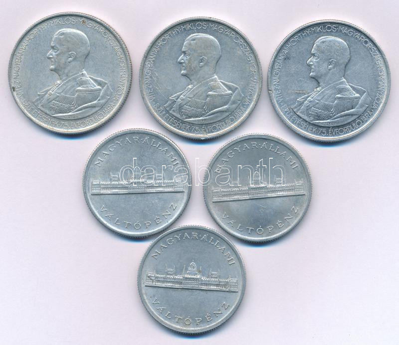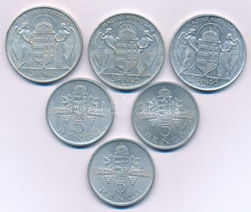 1943. 5P Al "Horthy Miklós születésének 75. évfordulójára" (3x) + 1945. 5P Al "Parlament" (3x) T:XF egyiken nagyobb karcok