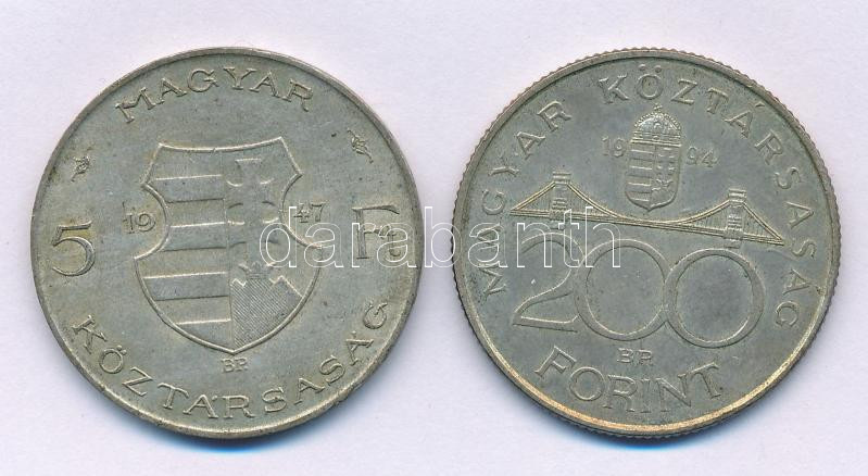 1947. 5Ft Ag "Kossuth" + 1994. 200Ft "Deák" T:VF,XF patina