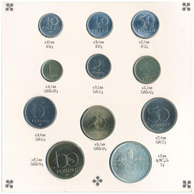 1993. 10f-200Ft (11xklf) forgalmi sor "Magyarország pénzérméi&quo...