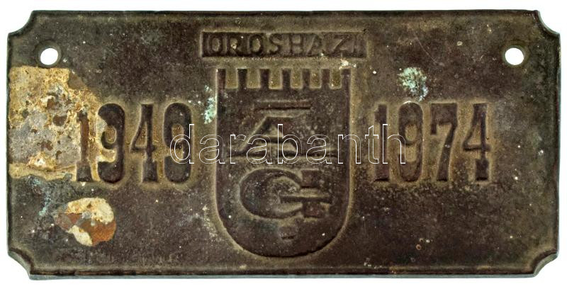 1974. "Orosházi ÁG. (Állami Gazdaság)" egyoldalas, bronz plakett (névtábla?) kétoldalt rögzítésre szolgáló fúrt lyukakkal (70x146mm) T:XF patina, nagyobb foltban ragasztónyom(?)