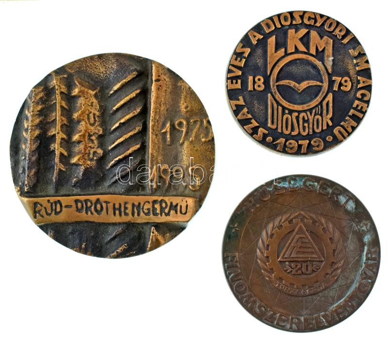 1979. "Száz éves a Diósgyőri SM Acélmű - LKM 1879" egyoldalas bronz emlékérem (61,5mm) + 1985. "Rúd - Dróthengermű 1975-1985" egyoldalas, öntött bronz emlékérem (85mm) + DN "Törzsgárda - Finomszerelvénygyár Hűségért - 20" egyoldalas bronz emlékérem (65mm) T:XF,VF, patina