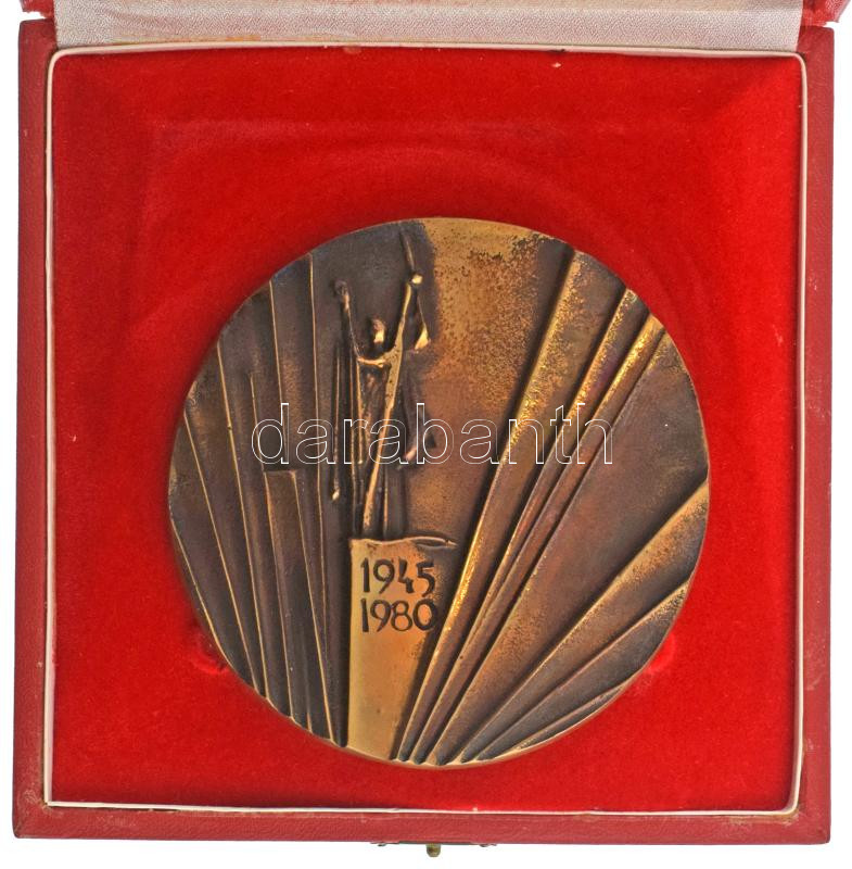 1980. "1945-1980" egyoldalas, öntött bronz felszabadulási emlékplakett, eredeti tokban (~105mm) T:AU, a tok picit viseltes