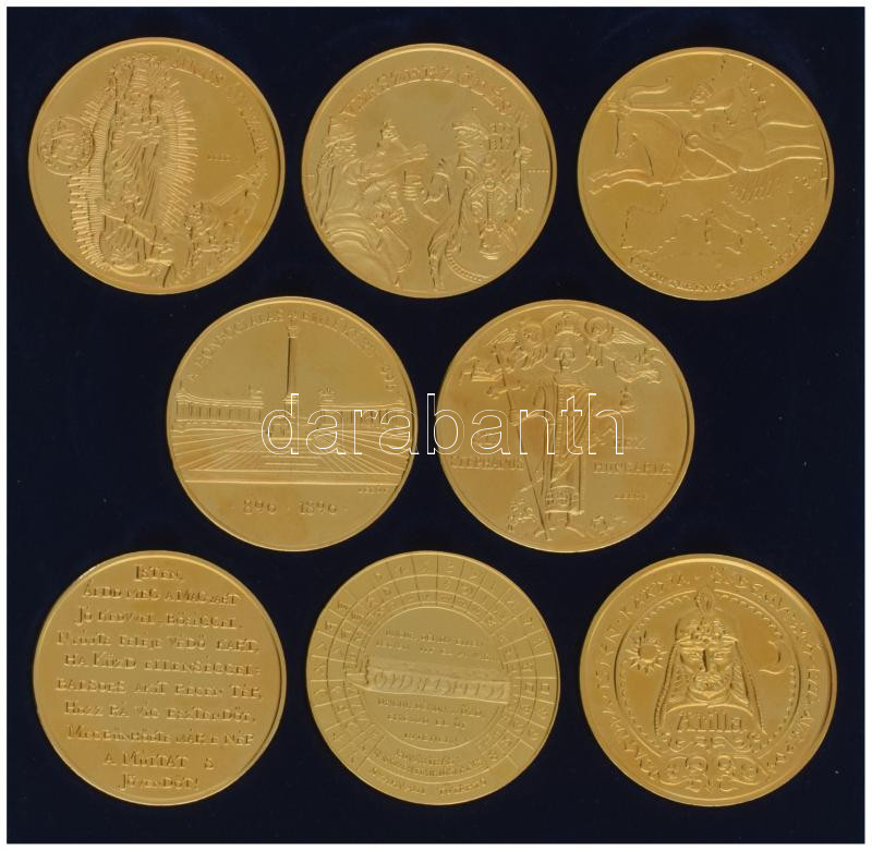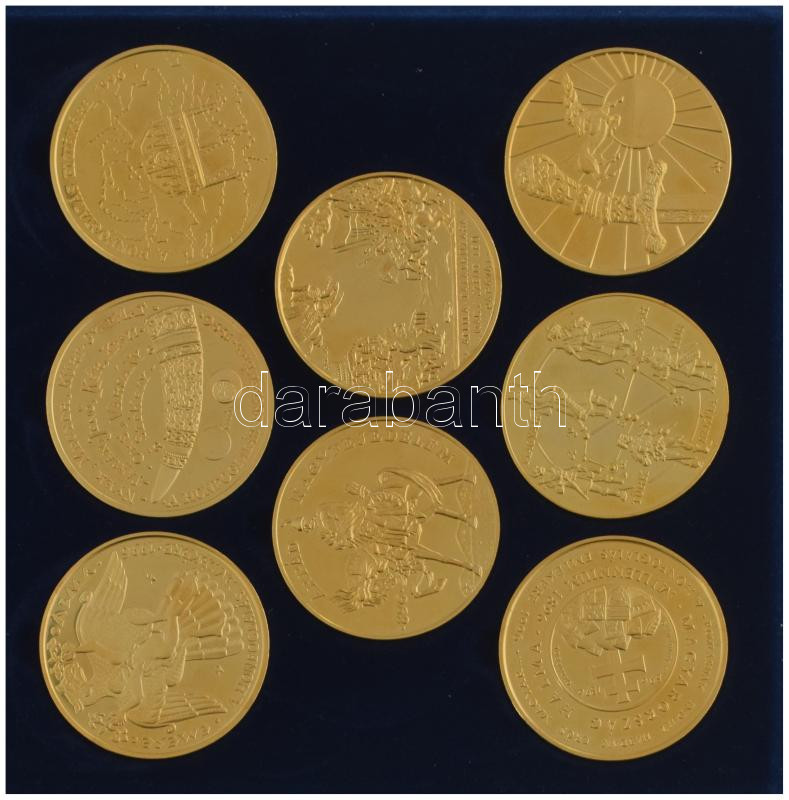 1996. "A magyarok honfoglalásának 1100 éves évfordulója emlékére" 8xklf db-ból álló aranyozott Cu emlékérem szett eredeti dísztokban. Tartalma: Attila, Attila találkozása Leó pápával, Kik vagyunk, Emese álma, Vérszerződés, Honteremtő hadjáratok, Honfoglalás, A haza építéséért. (42,5mm) T:PP