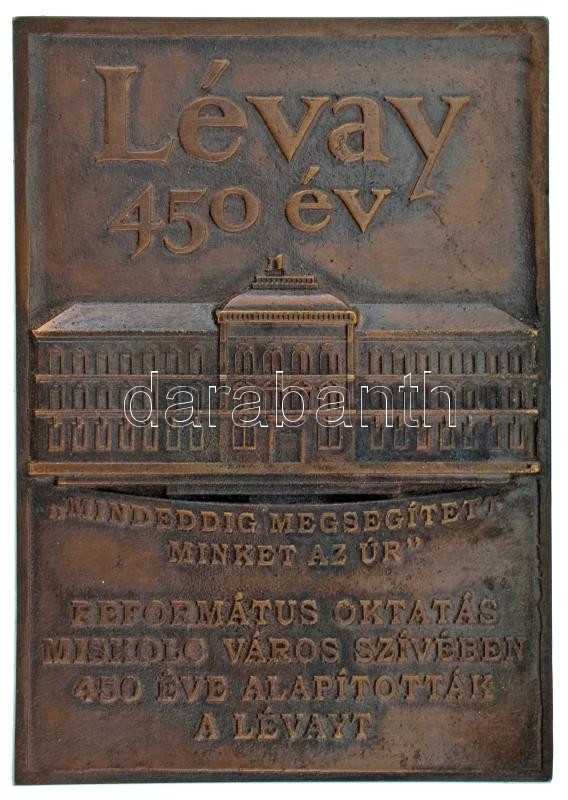 2010. "Lévay 450 év - ,,Mindeddig megsegített minket az Úr'' - Református oktatás Miskolc város szívében 450 éve alapították a Lévayt" egyoldalas bronz emlékplakett (63,5x89mm) T:XF, patina