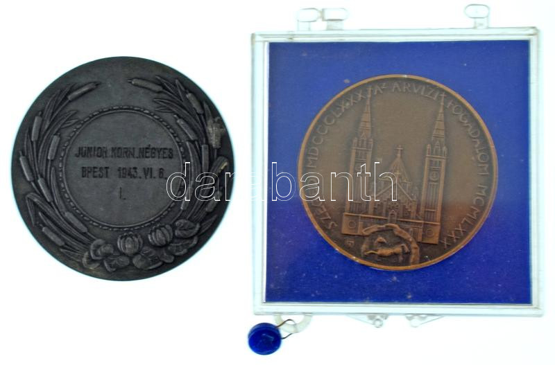Berán Lajos (1882-1943) 1943. "Magyar Evezős Szövetség" kétoldalas fém díjérem, hátoldalán "Junior Korm. Négyes Bpest 1943. VI. 6. I." gravírozással + Tóth Sándor (1933-2019) 1980. "Szent Gellért / Szeged MDCCCLXXX - Árvízi fogadalom MCMLXXX" kétoldalas bronz emlékérem, plombált, sérült "ÁPV" műanyag tokban (42,5mm) T:AU,XF