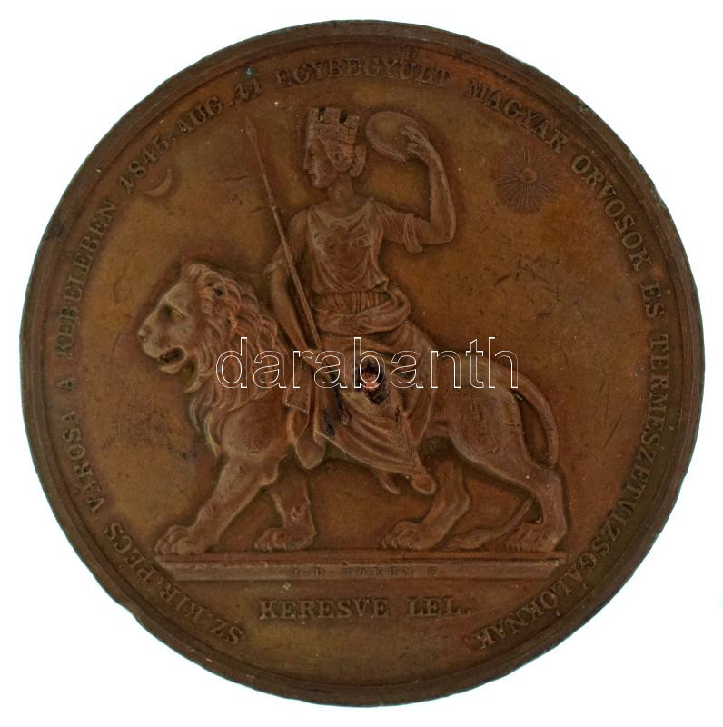 Boehm, Josef Daniel (1794-1865) 1845. "Sz. Kir. Pécs városa a kebelében 1845. aug. 11. egybegyült Magyar Orvosok és Természetvizsgálóknak - Keresve lel / Székesegyház" kétoldalas bronz emlékérem (51mm) T:AU,XF