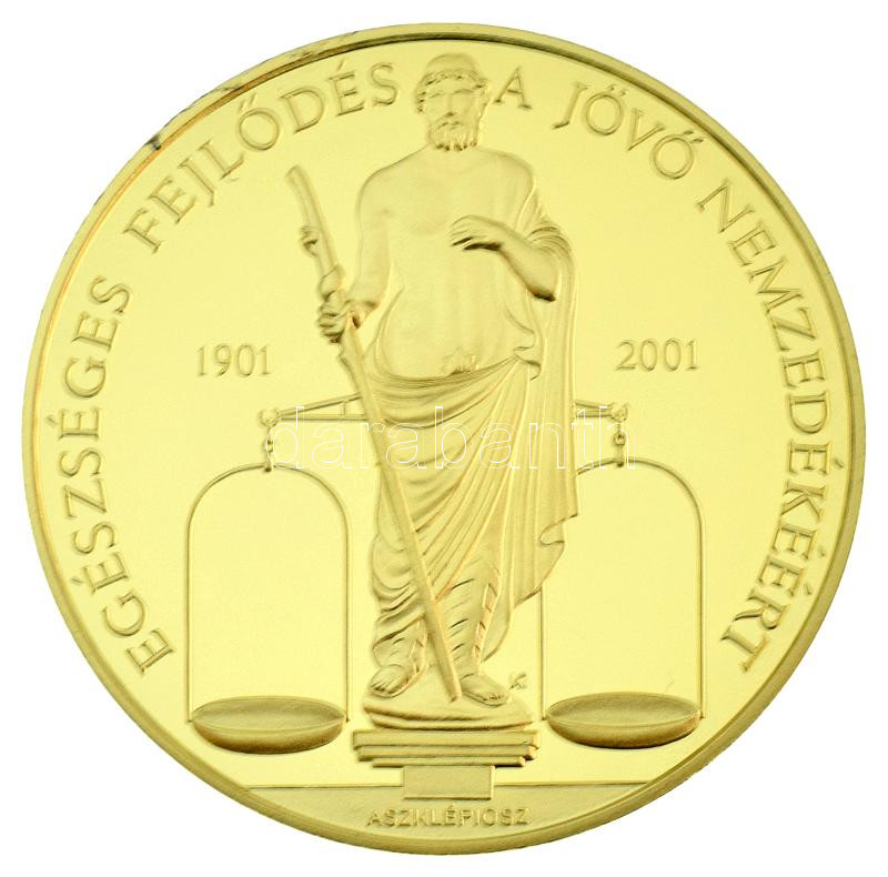 Kósa István (1953-) 2001. "Richter Gedeon RT. 2001 Centenárium / Egészséges fejlődés a jövő nemzedékéért - Aszklépiosz" kétoldalas aranyozott fém emlékérem kapszulában (42mm) T:PP