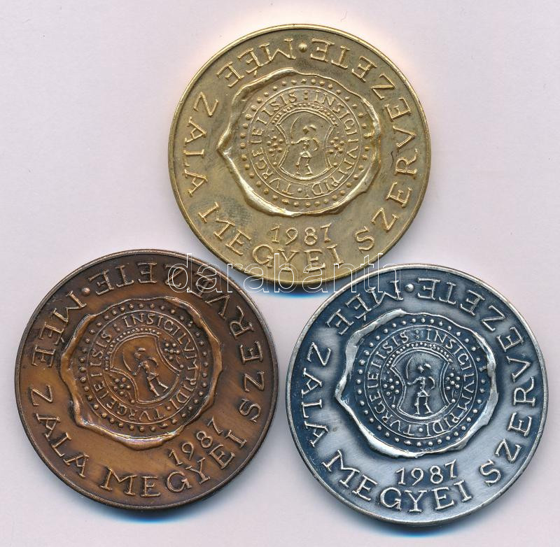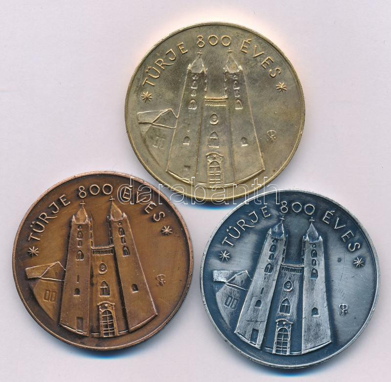 Szabolcs Péter (1942-) 1987. "MÉE Zala Megyei Szervezete / Türje 800 éves" (3x) ezüstpatinázott, bronz és aranyozott bronz kétoldalas emlékérem szett T:AU patina