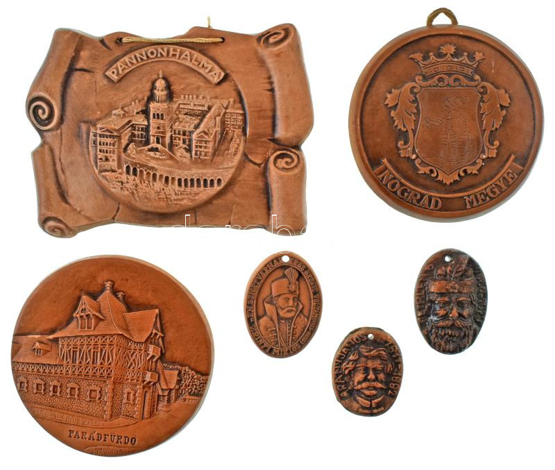 Vegyes, 6db-os kerámia plakett tétel, benne: DN "Pannonhalma" egyoldalas kerámia plakett (113x145mm) + DN "Parádfürdő" egyoldalas kerámia plakett (118mm) + DN "Nógrád megye" egyoldalas kerámia plakett (110mm) + DN "Zrínyi Miklós (1508-1566) - "Én Szigetvárnak erős őrzője voltam"" egyoldalas kerámia plakett, lyukasztva (45x62mm) + "Bethlen Gábor 1580-1629" egyoldalas kerámia plakett, hátoldalán "OZSA JÁNOS KOROND" jelöléssel, lyukasztva (43x62mm) + "Arany János 1817-1882" egyoldalas kerámia plakett, hátoldalán "OZSA JÁNOS KOROND" jelöléssel, lyukasztva (42x52mm) T:AU,XF, kis lepattogzások