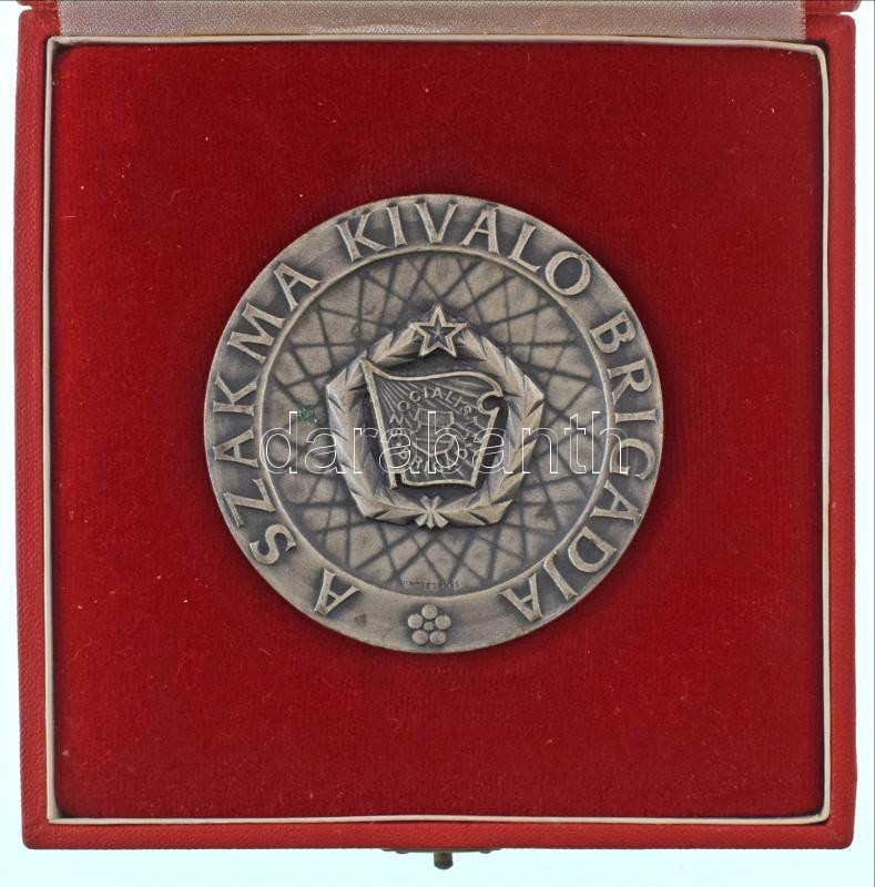 Vincze Dénes (1914-1972) DN "A Szakma Kiváló Brigádja - Szocialista Brigád" egyoldalas, ezüstpatinázott bronz plakett tokban (70mm) T:AU, patina
