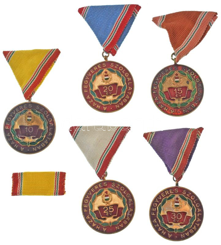 Description: 1965. "Szolgálati Érdemérem - A Haza Fegyveres Szolgálatában" 10, 15, 20, 25, és 30 év után, zománcozott és műgyantás fém kitüntetések eredeti mellszalaggal, egyik szalagsávval T:AU,XF