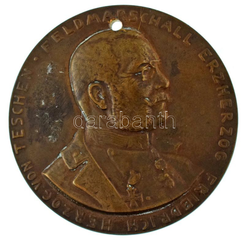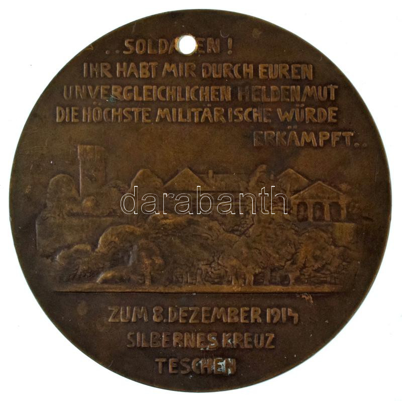 Austria 1914. "Erzherzog Friedrich Herzog von Teschen Feldmarschall / ...Soldaten! Ihr habt mir durch euren unvergleichlichen heldenmut die höchste militärische würde erkäpft.. Zum 8. Dezember 1914 Silbernes Kreuz Teschen" doubles-sided bronze commemorative medallion. Sign.: Helene Scholz (50mm) C:XF,VF hole