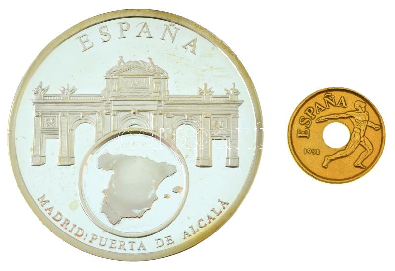 USA ND(1991) "European Currencies - Spain" silver plated Cu commemorative medal in capsule (50mm), with Spain 1991. 25 Pesetas "Olympic - Discus throw" gilt Al-bronze circulating commemorative coin inlay C:AU (originally PP), patina
