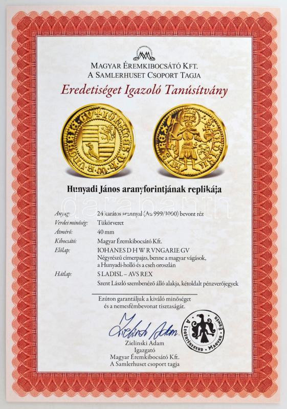 DN "A legértékesebb magyar érmék - Hunyadi János aranyforintjának replikája" aranyozott Cu emlékérem kapszulában, "COPY" jelzéssel, tanúsítvánnyal (40mm) T:PP