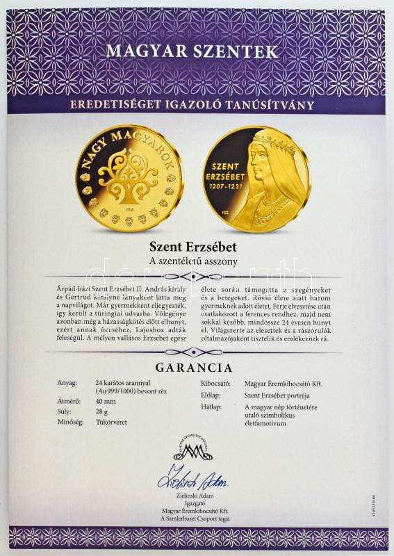 ifj. Szlávics László (1959-) 2011. "Nagy Magyarok / Szent Erzsébet" aranyozott Cu emlékérem kapszulában, tanúsítvánnyal (40mm) T:PP
