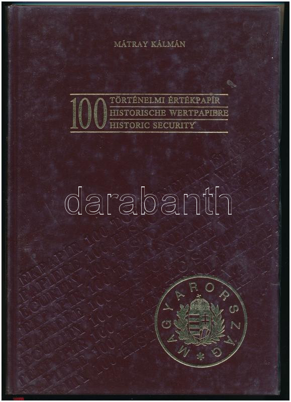 Mátray Kálmán: 100 történelmi értékpapír. Budapest, Kiadó Kft.-"B... https://www.darabanth.com/en/514-Auction-philately-postcards-numismatics-artwork-books-colletibles-jewelry/515.0/Numismatics/Numismatics-Literature~1304/Matray-Kalman-3Cem3E100-tortenelmi-ertekpapir3Cem3E-Budapest-Kiado-Kft-Blanket-GmbH-Spec~II3414553