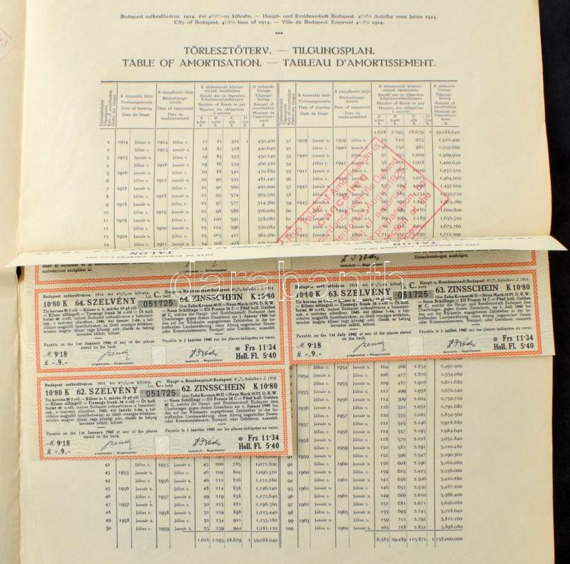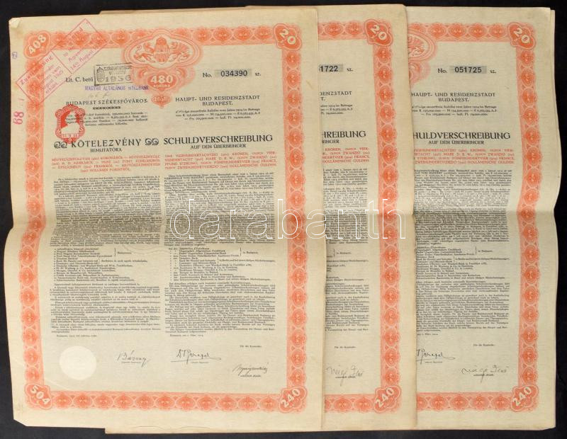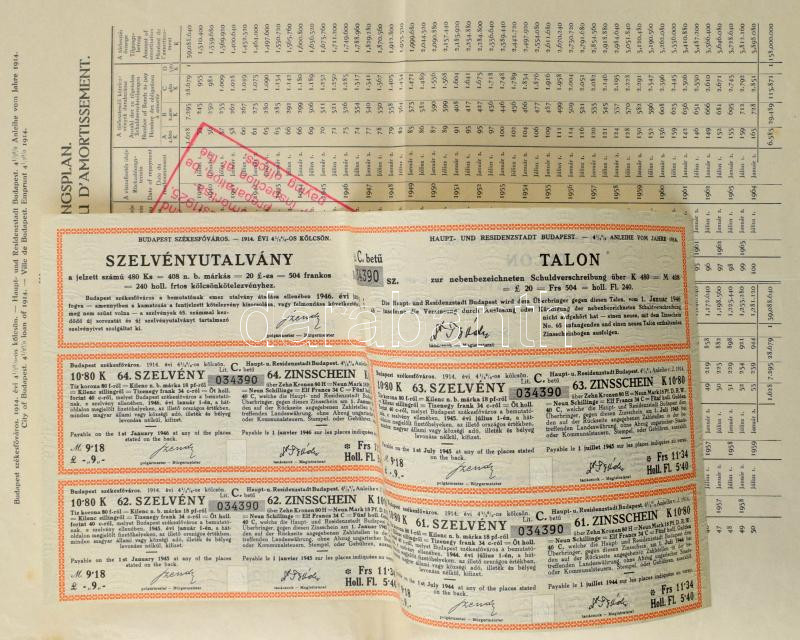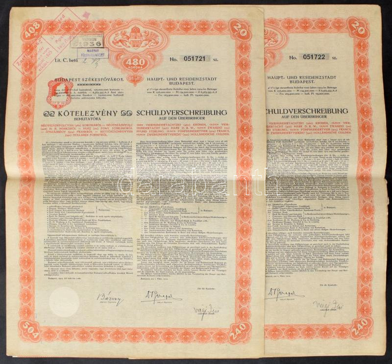 1914. Budapest "Budapest SzékesfÅ‘város" 4 1/2%-os kötelezvény bemutatóra 480K-ról, magyar és német nyelven, szárazpecséttel, felülbélyegzésekkel, szelvényekkel, vÃzjeles papÃron (5x), közte sorszámkövetÅ‘k T:VF,F