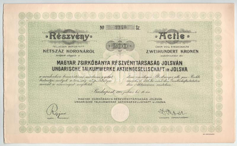 https://www.darabanth.com/en/514-Auction-philately-postcards-numismatics-artwork-books-colletibles-jewelry/515.0/Numismatics/Shares-and-Tickets~1307/1915-Budapest-3Cem3EMagyar-Zsirkobanya-Reszvenytarsasag-Jolsvan3Cem3E-reszvenye-200K-rol~II3480471