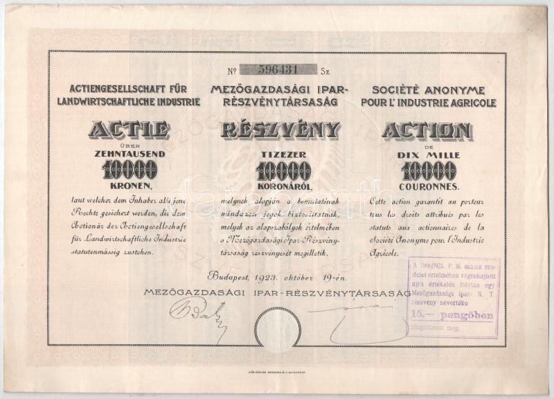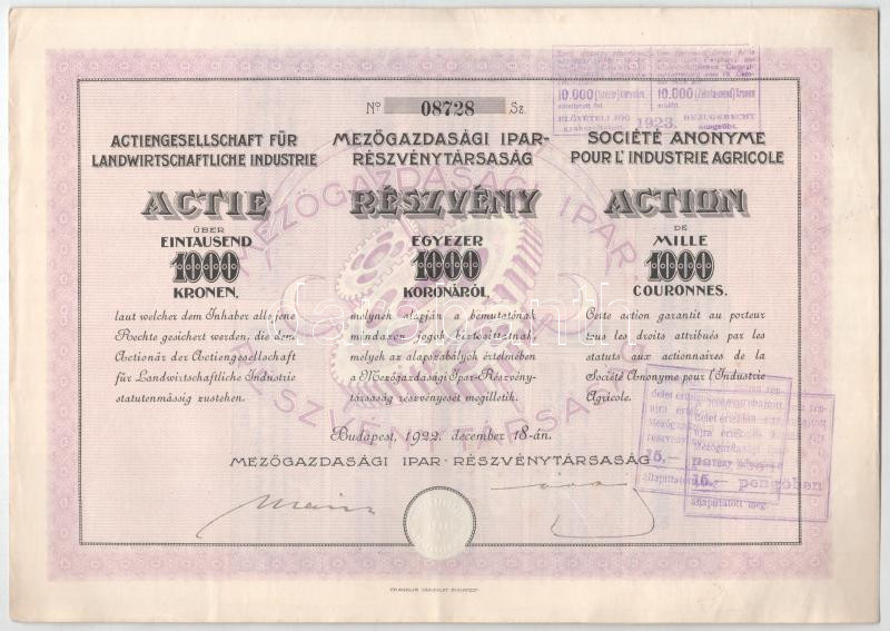 1922. Budapest "Mezőgazdasági Ipar-Részvénytársaság" részvénye 1000K-ról + 10.000K-ról, három nyelven, szárazpecséttel, bélyegzéssel T:F