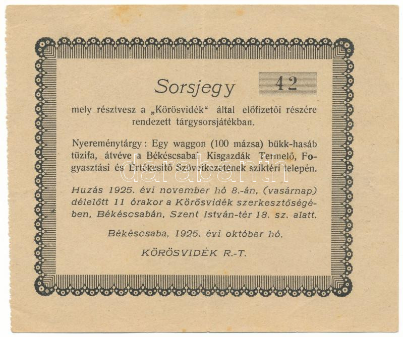 1925. Békéscsaba "Körösvidék R.-T." sorsjegy 100 mázsa bükk-hasáb tüzifáről "42" sorszámmal T:F