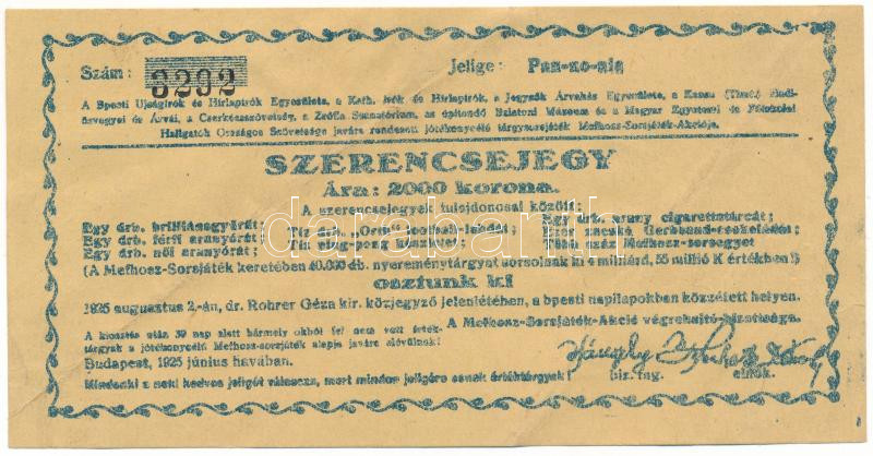 1925. Budapest "Budapesti Újságírók és Hírlapírók Egyesülete" szerencsejegy 2.000K "3292" sorszámmal T:F