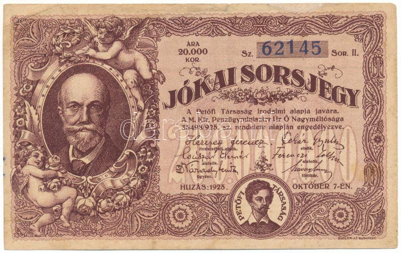 1925. Budapest "Jókai sorsjegy" 20.000K értékben, "62145 Sor. II." sorszámmal T:F