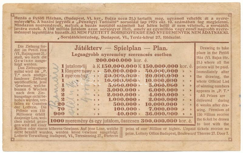 1925. Budapest "Jókai sorsjegy" 20.000K értékben, "6214...