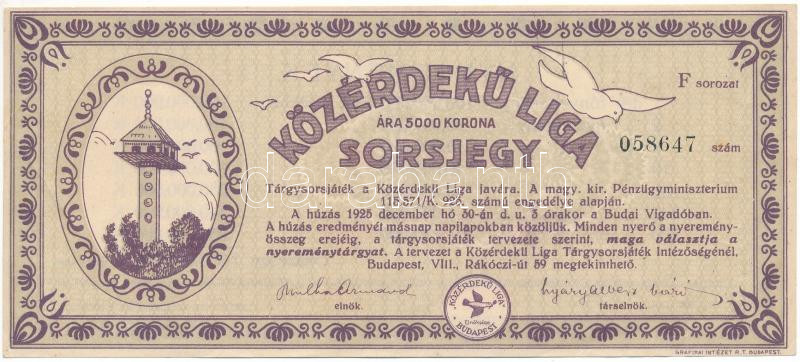 1925. Budapest "Közérdekű Liga Sorsjegy" 5000K értékben "F" sorozat "058647" sorszámmal T:F szép papír
