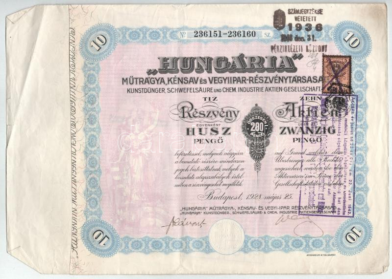 1928. Budapest " 'Hungária' Műtrágya, Kénsav és Vegyiip... https://www.darabanth.com/en/514-Auction-philately-postcards-numismatics-artwork-books-colletibles-jewelry/515.0/Numismatics/Shares-and-Tickets~1307/1928-Budapest-3Cem3E-Hungaria-Mutragya-Kensav-es-Vegyiipar-Reszvenytarsasag3Cem3E-reszv~II3482024
