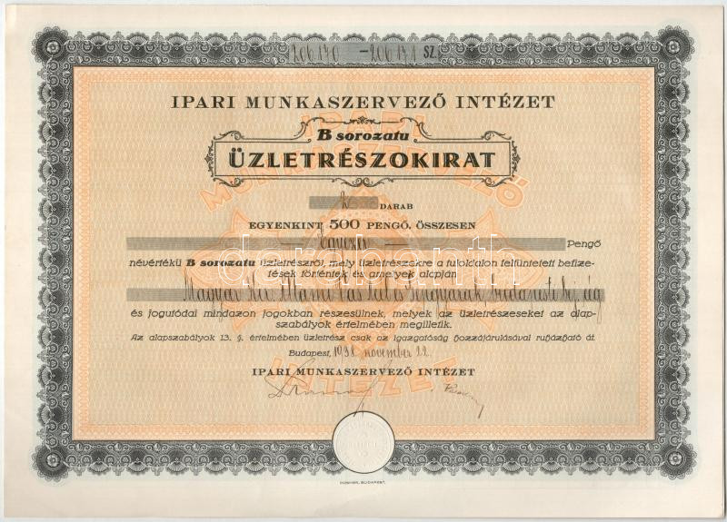 https://www.darabanth.com/en/514-Auction-philately-postcards-numismatics-artwork-books-colletibles-jewelry/515.0/Numismatics/Shares-and-Tickets~1307/1938-Budapest-Ipari-Munkaszervezo-Intezet-uzletreszokirata-500P-rol-szarazpecsettel-szel~II3063437