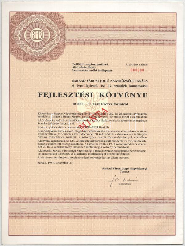 Description: 1987. Sarkad "Budapest Bank Rt. - Sarkad városi jogú nagyközségi tanács 6 éves lejáratú, évi 12 százalék kamatozású fejlesztési kötvénye" 10.000Ft-ról, "MINTA" felülbélyegzéssel, szelvényekkel T:AU