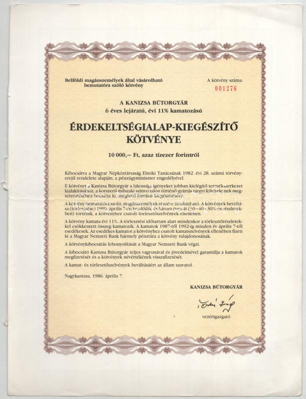 3db klf modern részvény, közte Nagykanizsa 1986. A Kanizsa Bútorgyár érdekeltségialap-kiegészítő kötvénye" 10.000Ft-ról T:UNC-XF