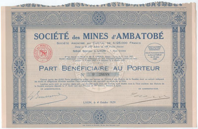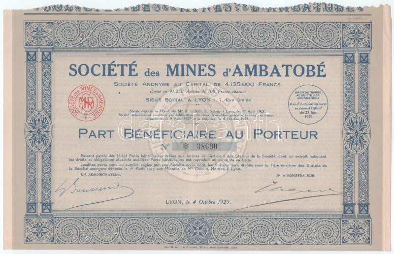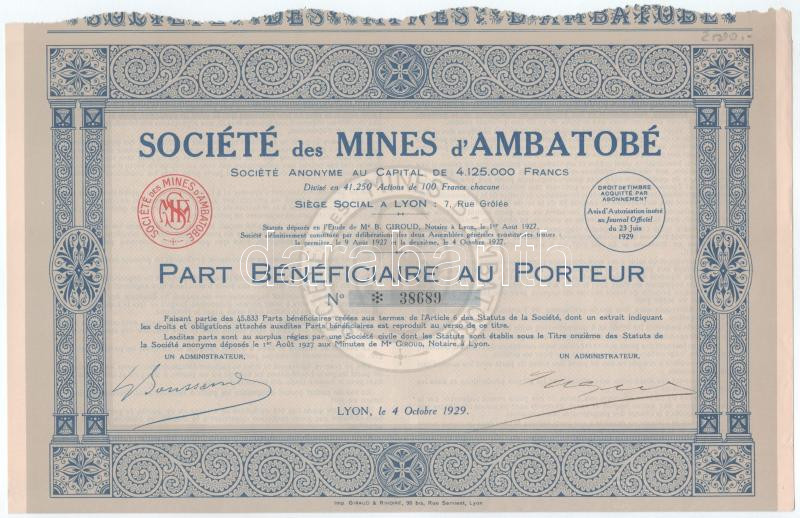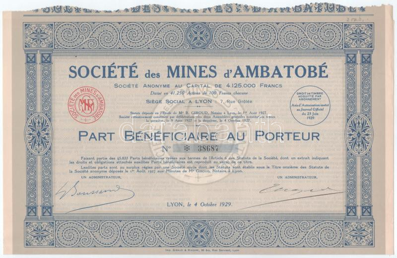 Franciaország / Lyon 1929. "Société des Mines d'Ambatobé&quo...