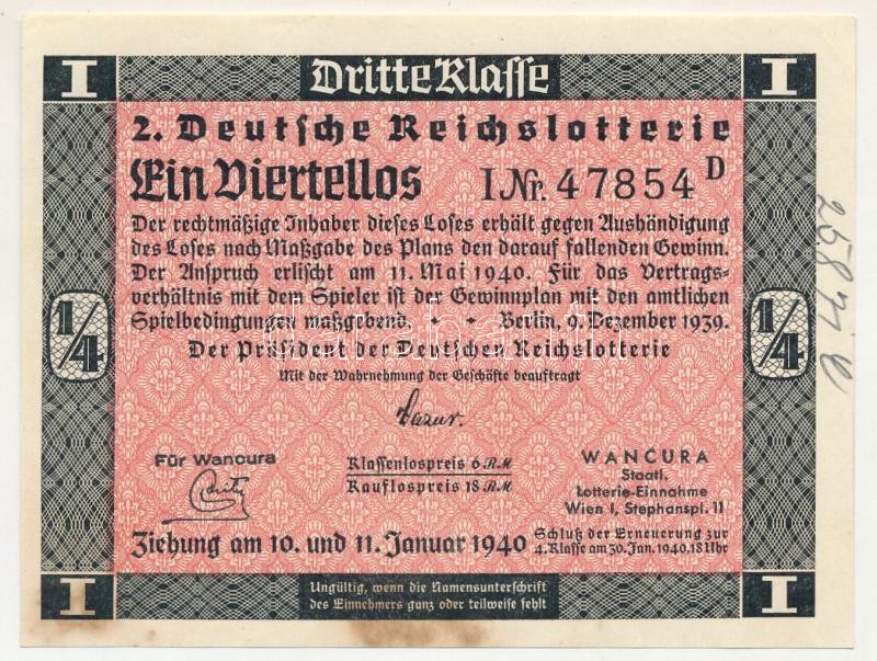 Description: Német Harmadik Birodalom 1940. "2. Deutsche Reichslotterie (2. Német Birodalmi Sorsjáték)" 3. osztály 1/4 sorsjegye, vízjeles papíron, sorszámozással T:XF hajtatlan, folt
