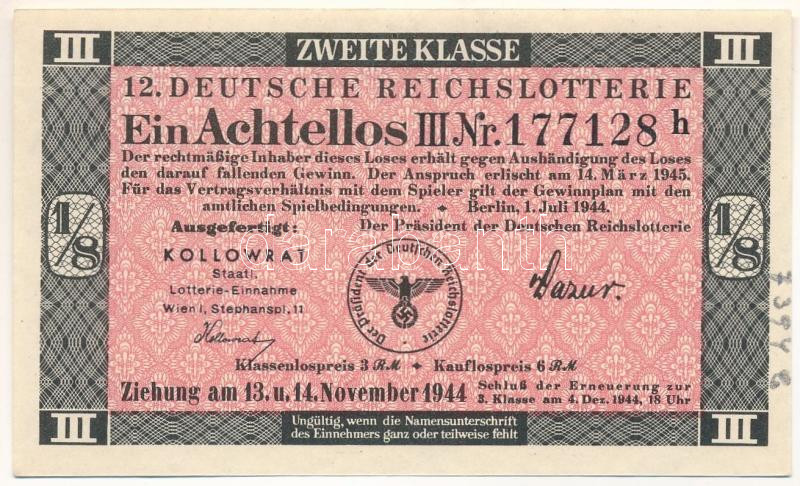 Description: Német Harmadik Birodalom 1944. "12. Deutsche Reichslotterie (12. Német Birodalmi Sorsjáték)" 2. osztály 1/8 sorsjegye, vízjeles papíron, sorszámozással T:AU