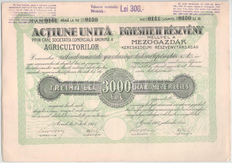 Románia / Arad 1923. "Mezőgazdák Kereskedelmi Részvénytársaság&qu... https://www.darabanth.com/en/514-Auction-philately-postcards-numismatics-artwork-books-colletibles-jewelry/515.0/Numismatics/Shares-and-Tickets~1307/Romania-Arad-1923-3Cem3EMezogazdak-Kereskedelmi-Reszvenytarsasag3Cem3E-reszvenye-3000L-rC5~II3412136