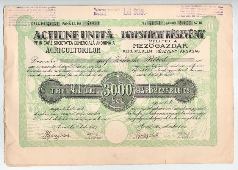 Description: Románia / Arad 1923. "Mezőgazdák Kereskedelmi Részvénytársaság " részvénye 3000L-ről, szelvényekkel, szárazpecséttel és felülbélyegzésekkel T:XF hajtatlan, de szakadásokkal