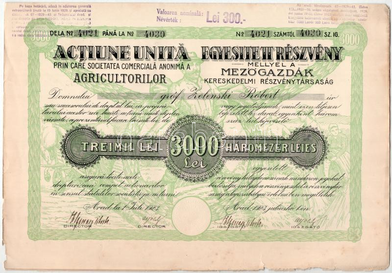 Románia / Arad 1923. "Mezőgazdák Kereskedelmi Részvénytársaság&qu... https://www.darabanth.com/en/514-Auction-philately-postcards-numismatics-artwork-books-colletibles-jewelry/515.0/Numismatics/Shares-and-Tickets~1307/Romania-Arad-1923-Mezogazdak-Kereskedelmi-Reszvenytarsasag-reszvenye-3000L-rol-szelv~II3063771