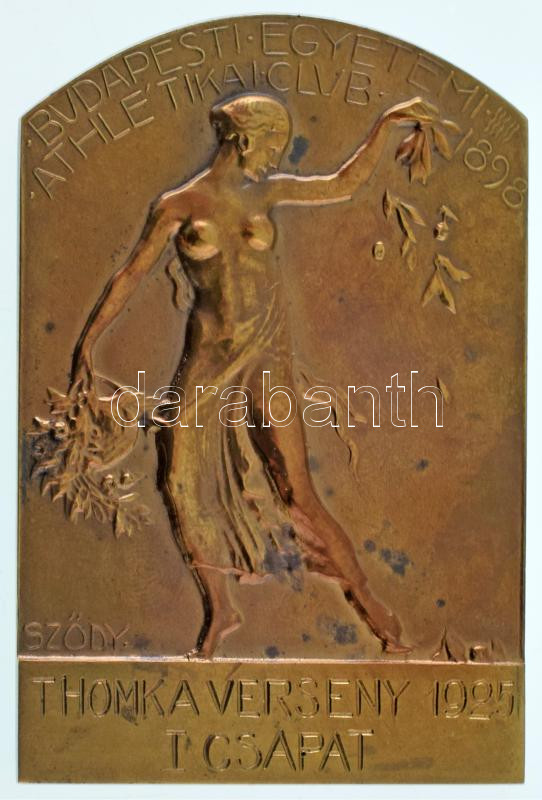 1925. "Budapesti Egyetemi Athletikai Club - THONKA VERSENY 1925 I CSAPAT" bronz plakett. Szign.: Sződy Szilárd (1878-1939) (70x46mm) T:AU