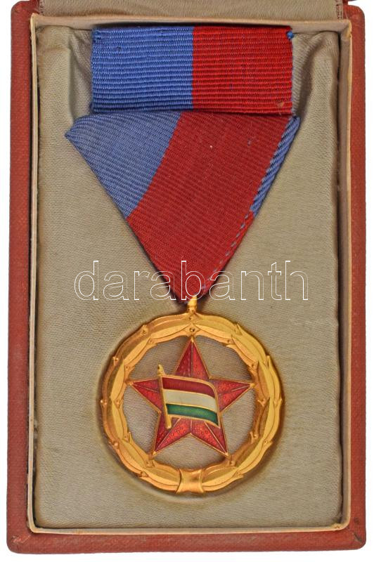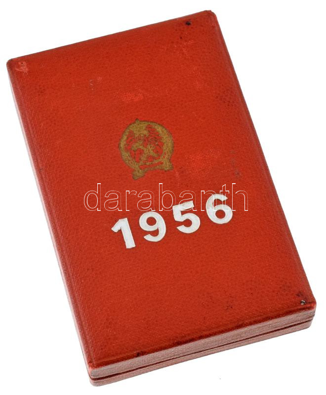 1949. "A Magyar Népköztársasági Sport Érdemérem arany fokozata" zománcozott, aranyozott kitüntetés mellszalagon, szalagsávval, eredeti tokban (rajta utólag ráragasztott "1956") T:AU