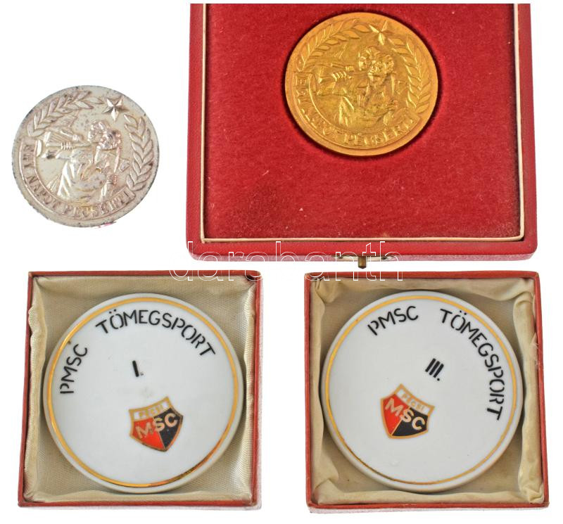 1980 k. "PMSC (Pécsi Munkás SC) tömegsport" I. és III. helyért járó mázas kerámia díjérem gyártói jelzés nélkül, tokban (60mm) + 1960. "Egy napot Pécsért" egyoldalas aranyozott és ezüstözött emlékérem egy tokban (2xklf) (49mm) T:AU,VF