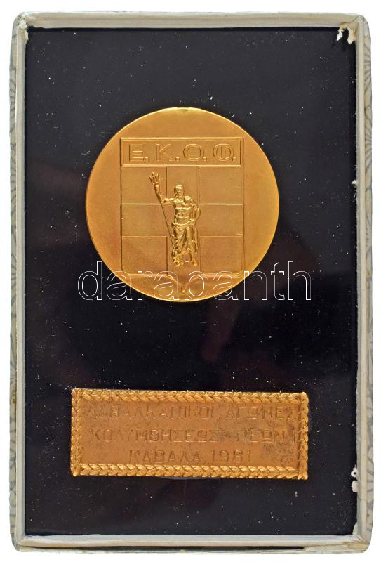 Görögország 1981. "E. K. O. O. XI. Balkáni Ifjúsági Úszóverseny - Kavala 1981" egyoldalas, aranyozott fém emlékérem áttetsző műanyag alapon, kopott tokban T:AU,XF, patina