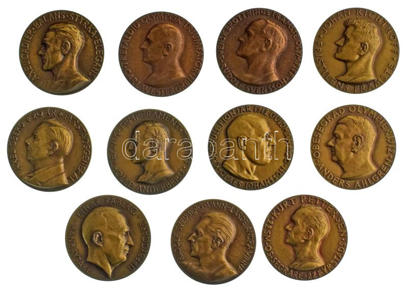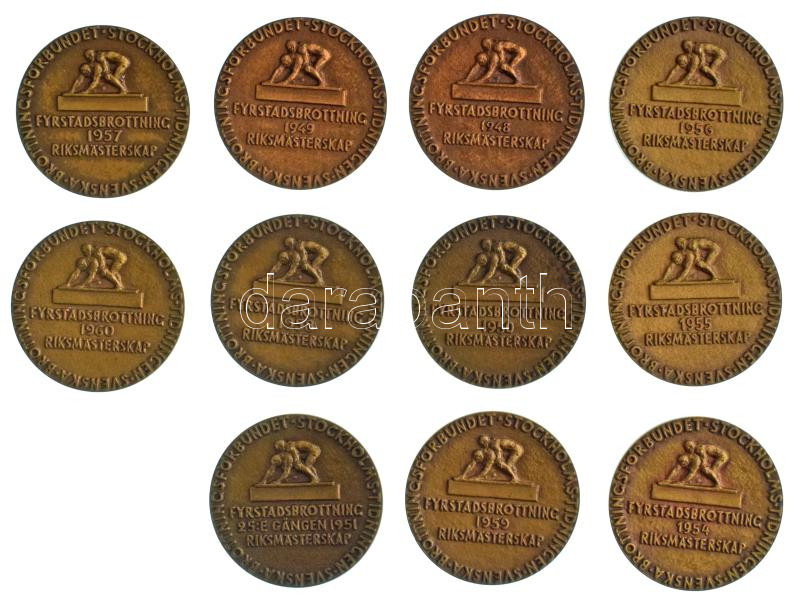 Svédország 1948-1960. "A svéd birkózás legkiválóbb olimpikonjai / Stockholms-Tidningen - Svéd Birkózószövetség - Országos Bajnokság - Négycsapatos Birkózótorna" kétoldalas bronz birkózó díjérem sorozat (11xklf) Előlapon svéd birkózók portréjával, időrendi sorrendben: "Rudolf Svensson", "Carl Westergren", "Claes Johansson", "Einar Raberg", "Kurt Pettersén", "Anders Ahlgren", "Johan Richthoff", "Axel Cadier", "Olle Anderberg", "Rudolf Svedberg", "Axel Öberg" (40mm) T:UNC,AU